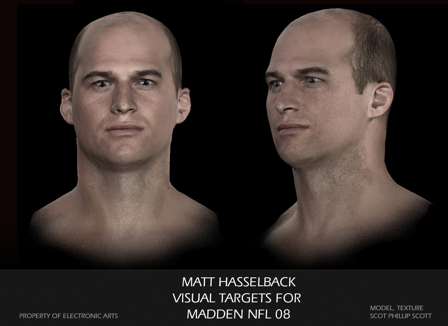 While working at Tiburon, one of my largest tasks and achievements was developing a new standard for skin-tones and player head models. There were several hurdles to overcome, one of which was an old system that needed to be updated for hundreds of players. My solution was to create 8 skintone groups, one of which would be used for every player in the game, no exceptions. These shots are of the players I chose to represent the groups. To show all eight would be a little much, so I chose both extremes and on in the middle. The players shown are Matt Hasselback of the Seattle Seahawks,Larry Fitzgerald of the Arizona Cardinals and Ronnie Brown of the Miami Dolphins.
